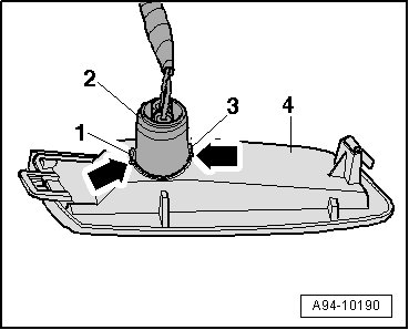 - When installing the bulb holder - 2 - make sure that the markings - 1 - and - 3 - align with the markings - arrows - on the side marker lamps - 4 -.