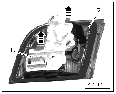 - Open the locking bracket - arrows - and remove the bulb holder - 1 - on the inner tail lamp - 2 -.