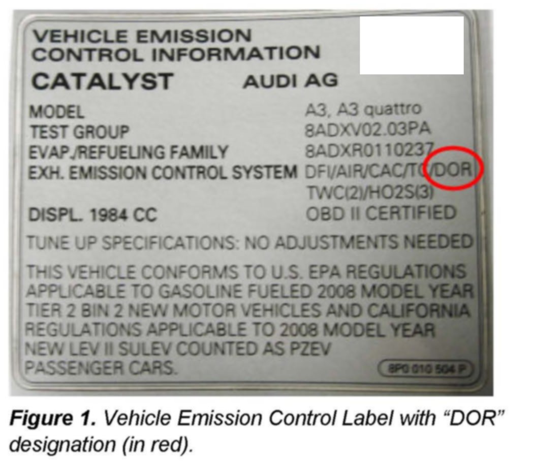 The vehicle emissions control information label does not have "DOR" designated in the exhaust emission control system field.