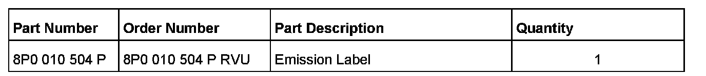 Tip: To order replacement labels after using your initial allocation, please call Resolve Corp.. When ordering from Resolve, please use part number 8P0 010 504 P RVU. Please be sure to have the VIN of the affected vehicle when calling for the replacement label.