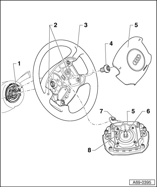 - Position airbag unit - 5 - in steering wheel.