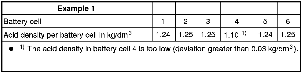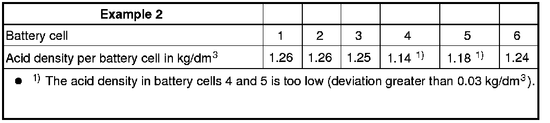 • The measured values for the specific density of the individual battery cells must not deviate by more than 0.03 kg/dm3, otherwise the battery should be replaced.