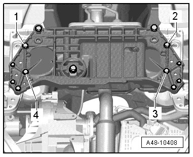 - Loosen the steering gear bolts - 2 - and - 3 - on the right side of the vehicle and remove them.