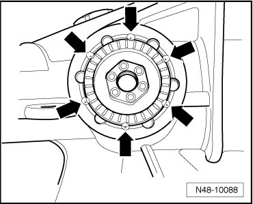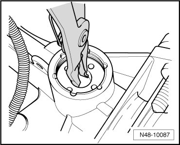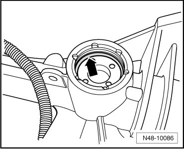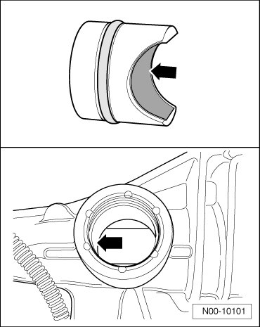 - Coat the new thrust piece - arrow - (contact surface to rack), gasket and hole in the steering gear housing - arrow - with the grease (G 052 192 A1) provided.