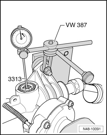 - Rotate the steering rack with the (V.A.G 1332) set to 40 Nm and the (V.A.G 1923) on the tie rod. When (V.A.G 1332) disengages, set dial gauge to "0".