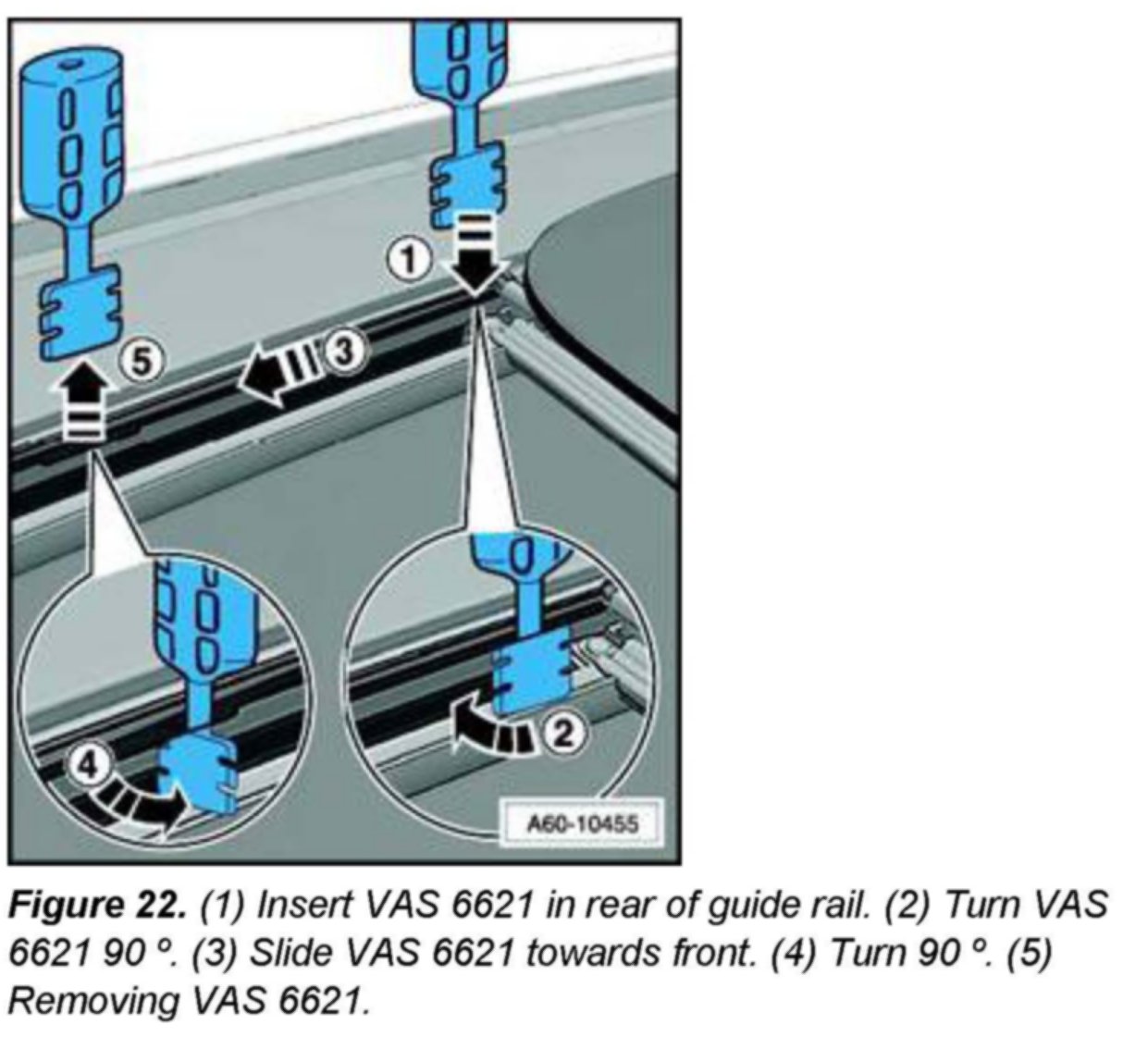Cleaning of Guide Rails:1. The bulk of the old lubricant, dirt and debris will be removed as follows: Insert the VAS 6621 to the rear of the guide rail (Figure 22, 1), turn it 90° (Figure 22, 2) and slide it toward the front (Figure 22, 3). Turn the tool 90° once again and remove it (Figure 22, 4-5). Clean the old lubricant and debris from the tool. Repeat this procedure starting from the front of the guide rail and slide the tool toward the rear. Perform this procedure to both sides.