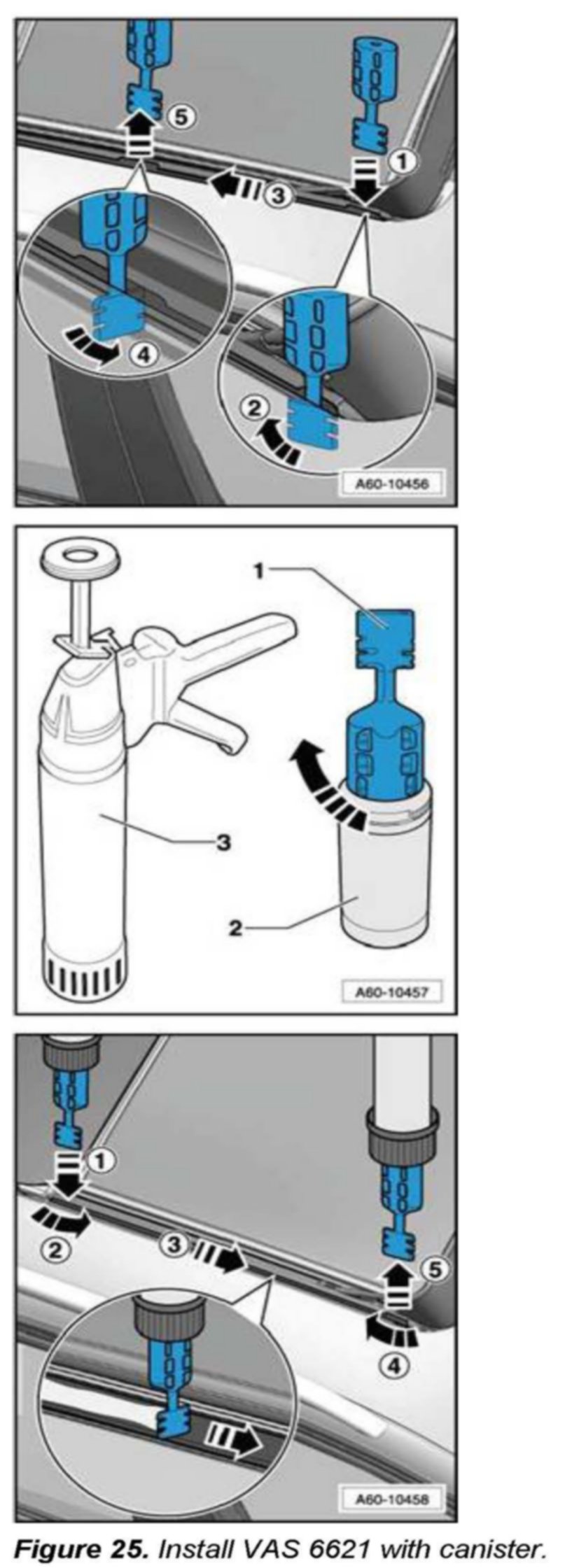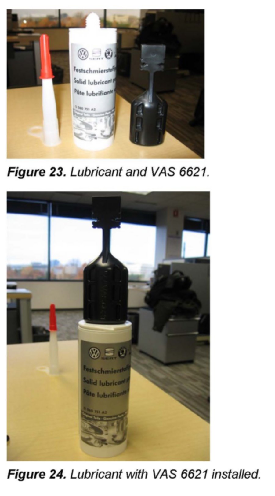 1. Thread the VAS 6621 tool onto the lubricant canister (G 060 751 A2). Install the assembly into the VAG 1628.