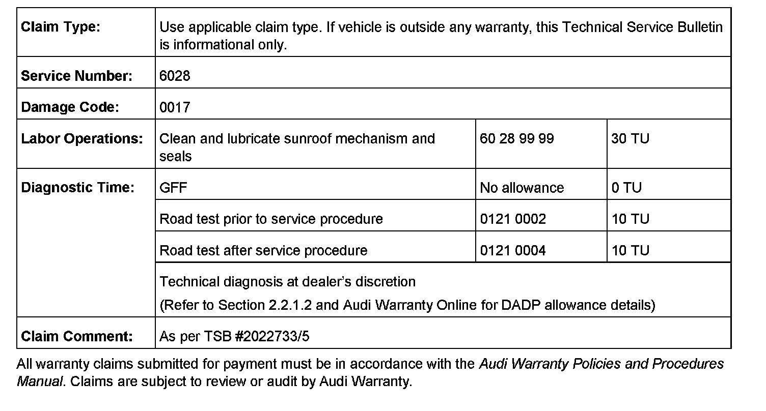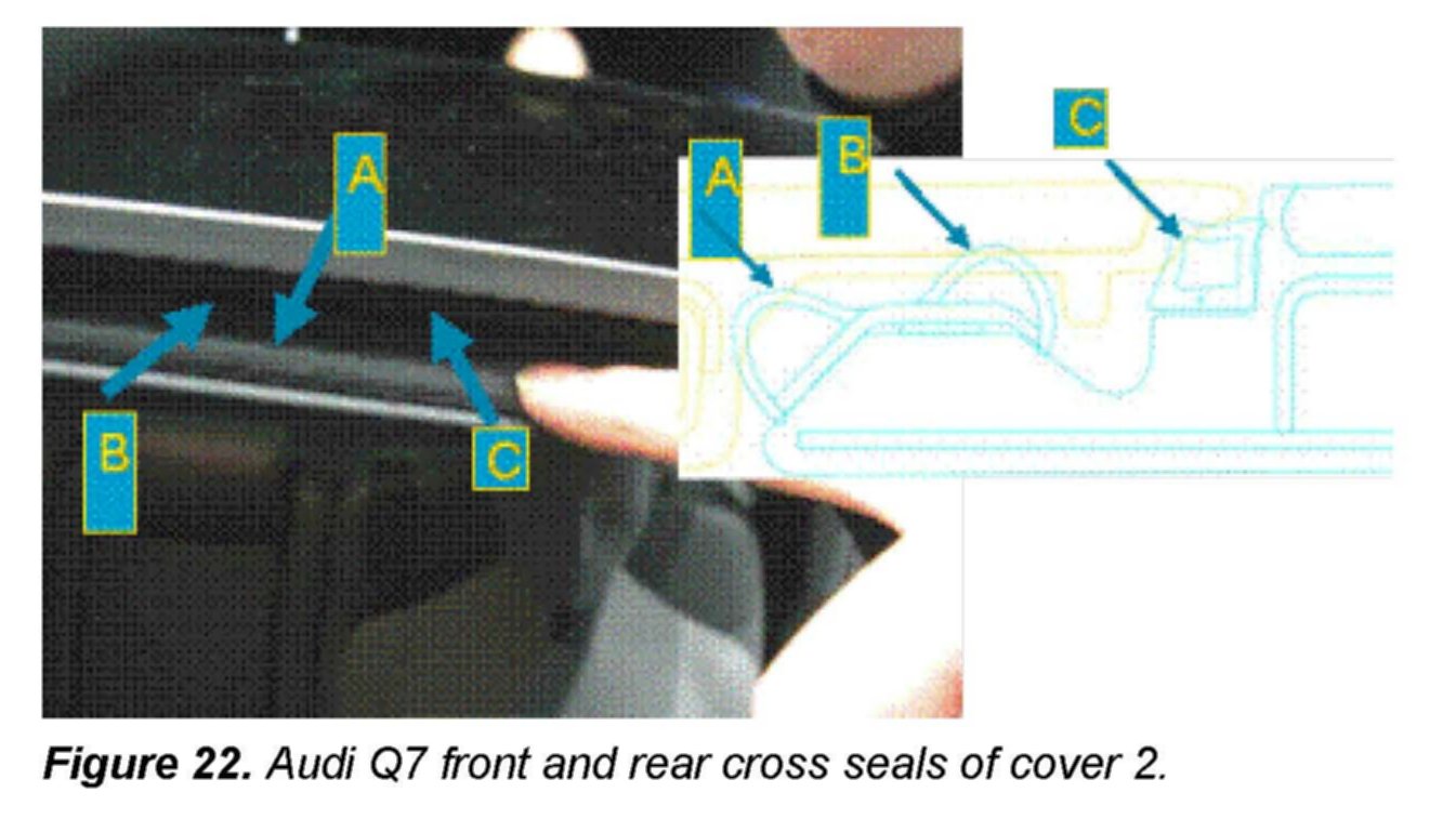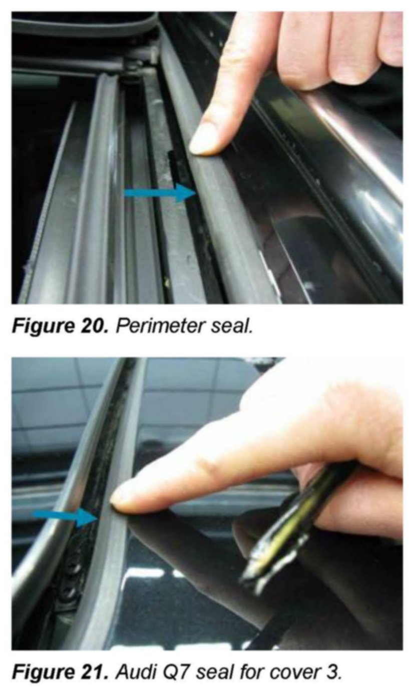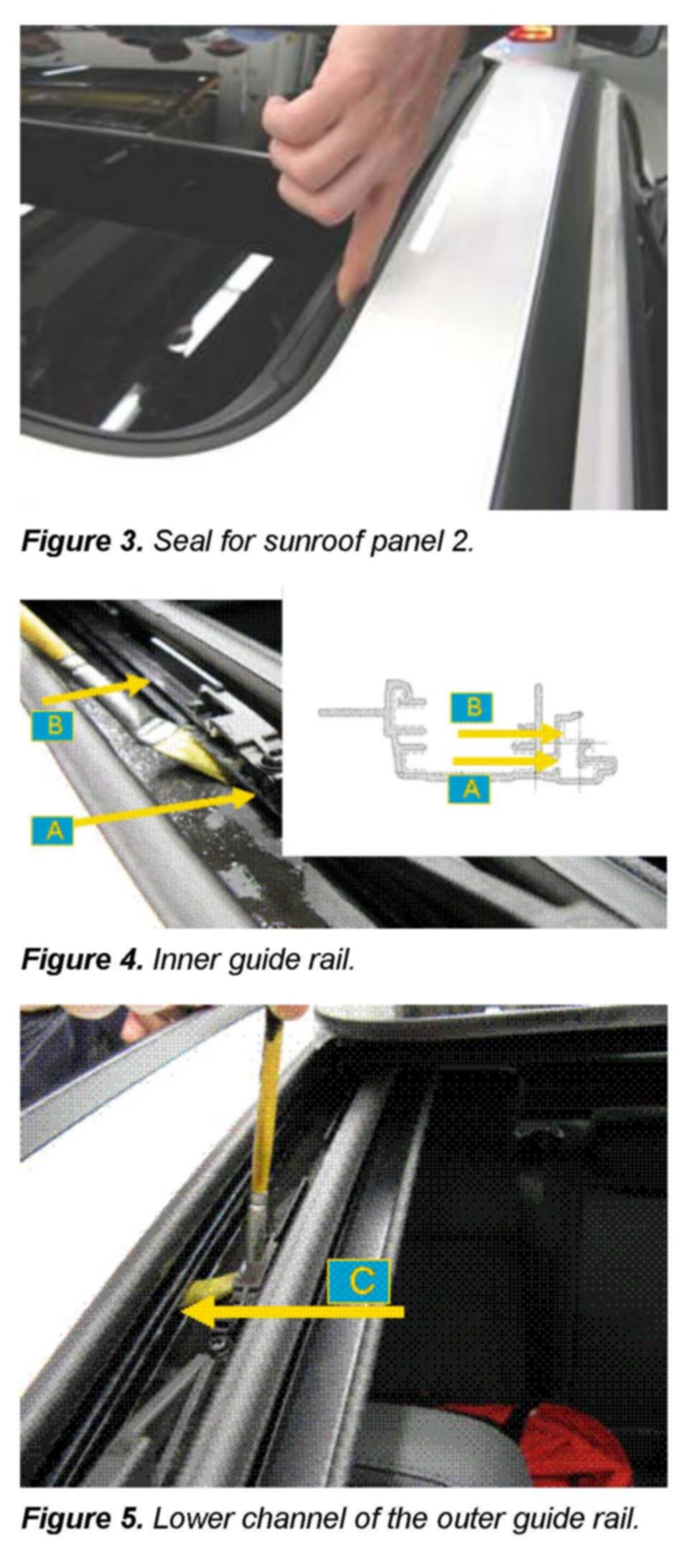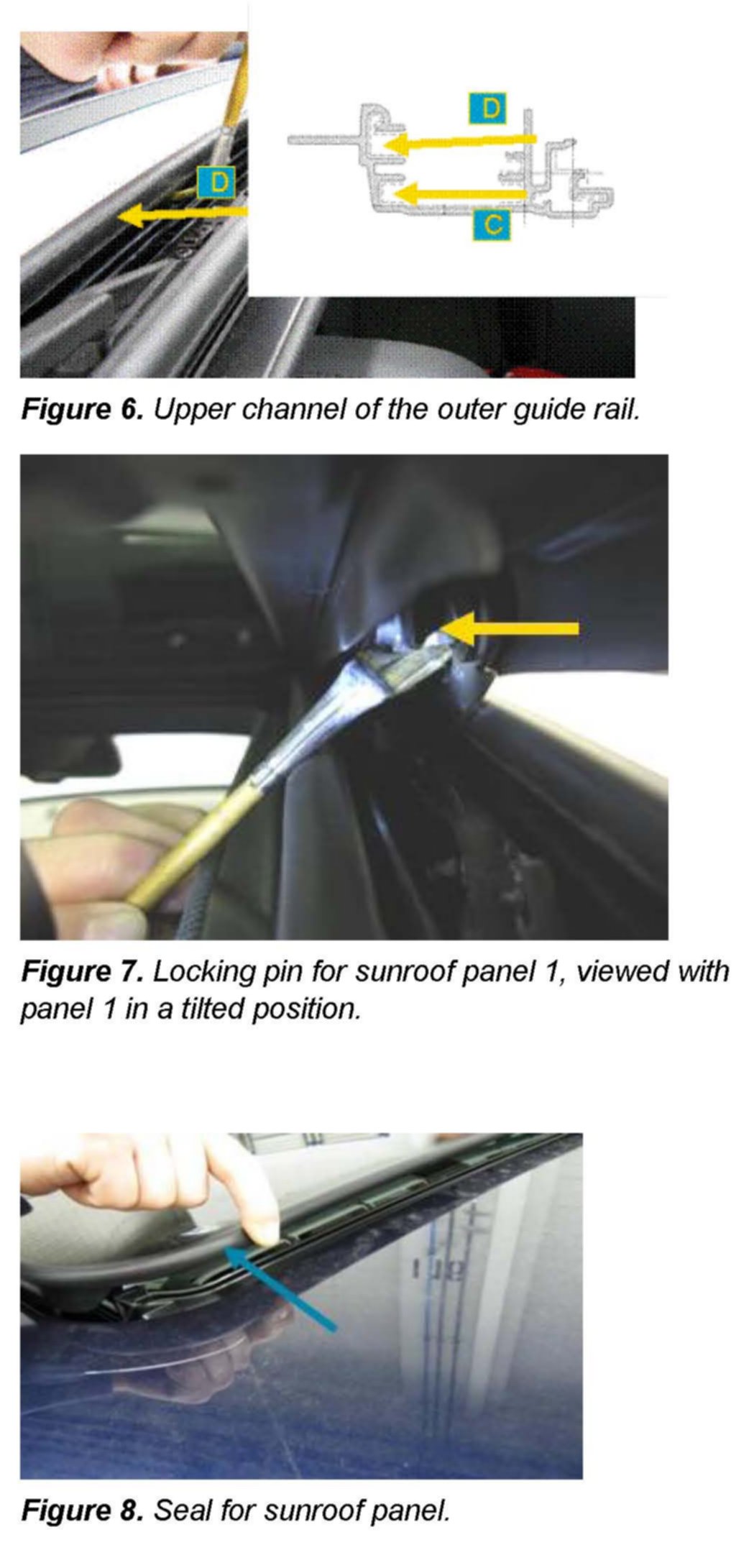4. Incorrectly installed, or incorrectly adjusted sunroof panels, cause tension and are another source of noise. Check and adjust as necessary using ElsaWeb or refer to TSB 2018898.