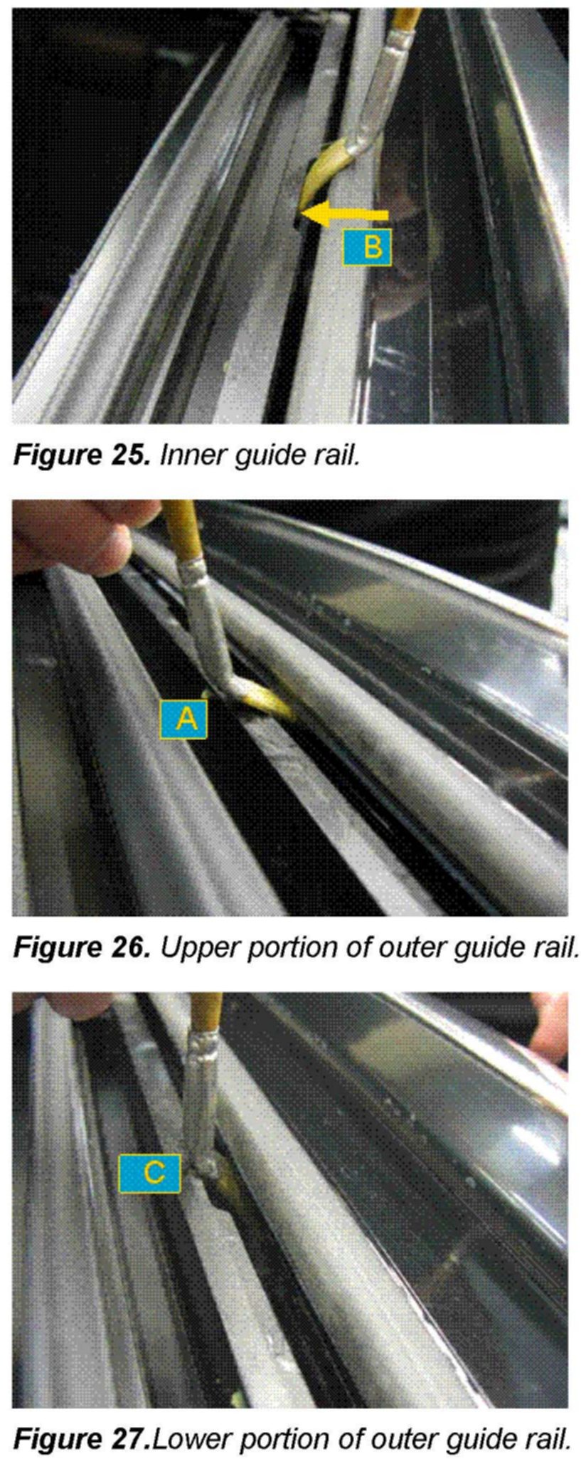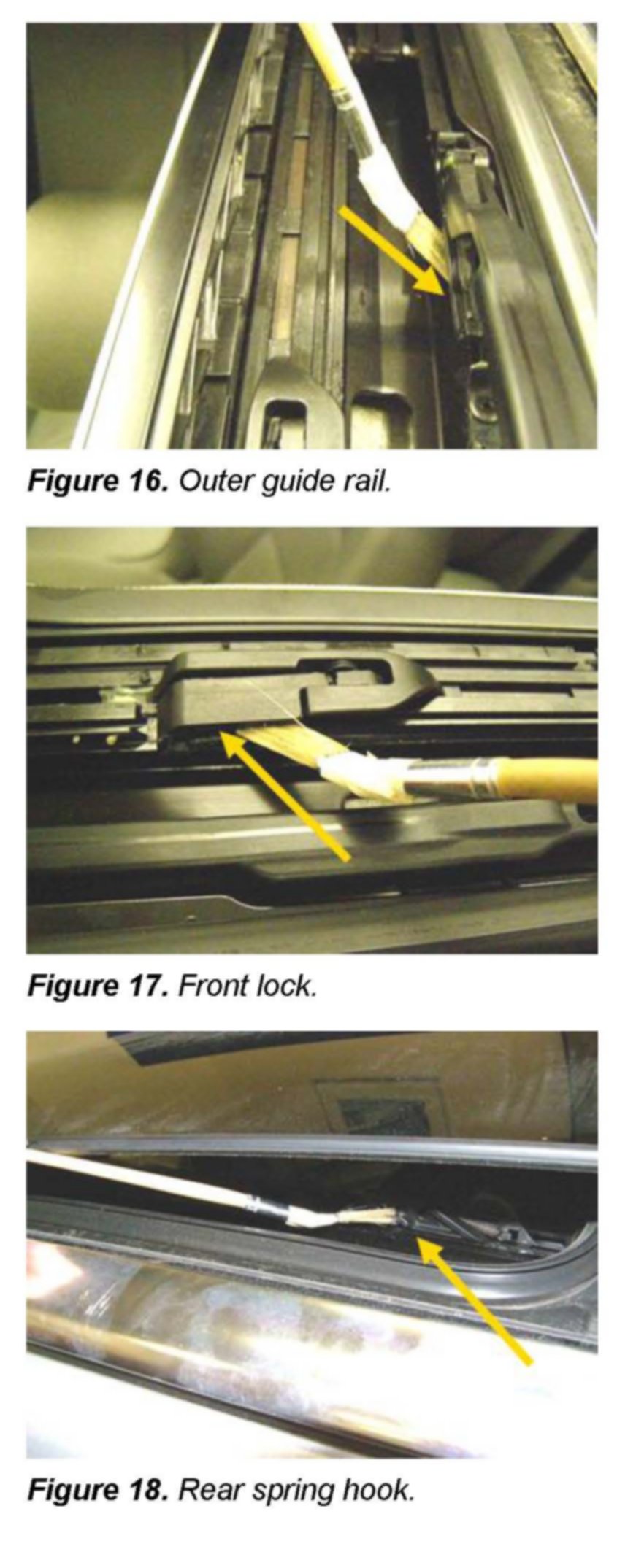 3. After application of the appropriate lubricant to the indicated areas is complete, open and close the sunroof completely 2 to 3 times to adequately distribute the lubricant.