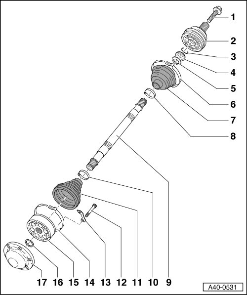 • Twelve-point bolt with ribs: 70 Nm +90° turn. Loosening and tightening, refer to => [ Drive Axle Twelve-Point Bolt with Ribs, Loosening and Tightening ] Drive Axle Twelve-Point Bolt With Ribs, Loosening and Tightening.