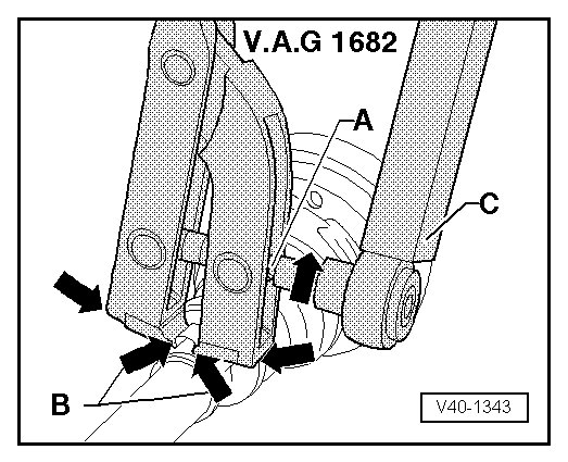 - Attach (V.A.G 1682) as shown in illustration. When doing this, make sure that edges of clamping pliers are seated in corners - arrows B - of clamp.