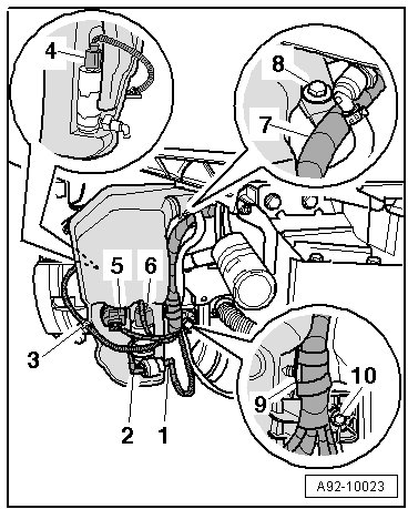 - Remove the line - 3 - on the filler tube - 2 - for the windshield washer fluid reservoir to the EVAP canister.