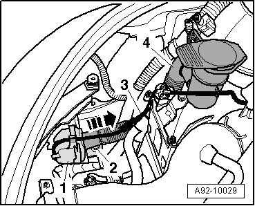- Unclip the auxiliary heater fuel line - 3 - on the windshield washer fluid reservoir - 1 - and on the filler tube - 4 -.