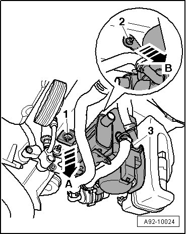 - Release the lower auxiliary heater bracket - 3 - on the longitudinal member in - direction of arrow A - and on the side of the longitudinal member in - direction of arrow B -.