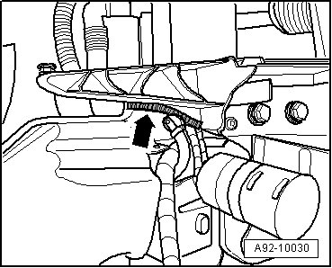 - Remove the filler tube in - direction of arrow - from the windshield washer fluid reservoir.