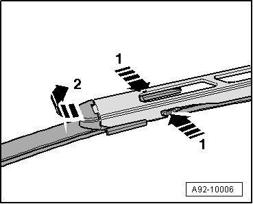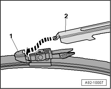 - Guide wiper arm tab - 2 - into wiper blade - 1 - - arrow -.