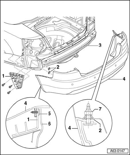 NOTE: Before installing bumper cover - 1 -, check to see if threaded pins - 2 - on bumper sides and grommets - 3 - are present.