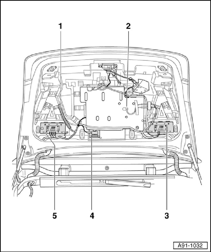 - Remove bolts -arrows- and remove left antenna module -1-.