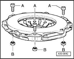 - Insert 3 bolts for securing pressure plate - A - into mounting holes on pressure plate located at 120 degrees (1/3) intervals, as shown in illustration.