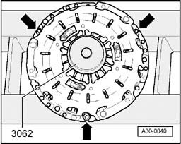 ^ When installing a new clutch plate in conjunction with a used SAC pressure plate, the adjuster ring in the pressure plate has to be reset by turning it back as far as it will go. If you do not reset the adjuster ring in the pressure plate, the SAC pressure plate will operate with reduced clamping force, which will cause excessive wear, especially of the clutch plate (clutch will then slip).