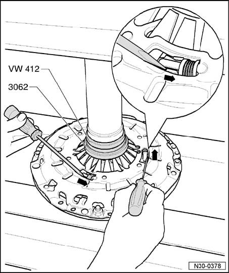 - Apply two screwdrivers to forks on adjuster ring. Use press tool to apply pressure to pressure plate until it is just possible to move adjuster ring.