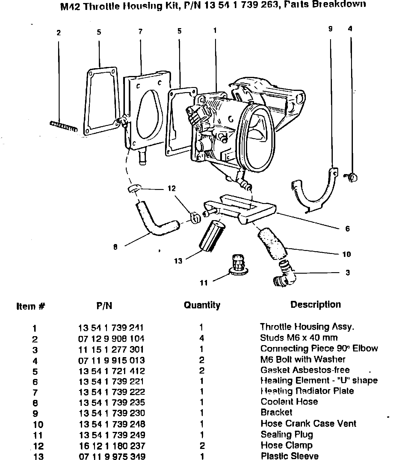Parts Information:The throttle housing kit can be ordered under BMW part number 13 54 1 739 263 which includes all of the necessary gaskets and mounting hardware.