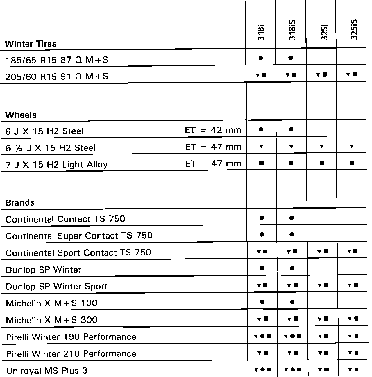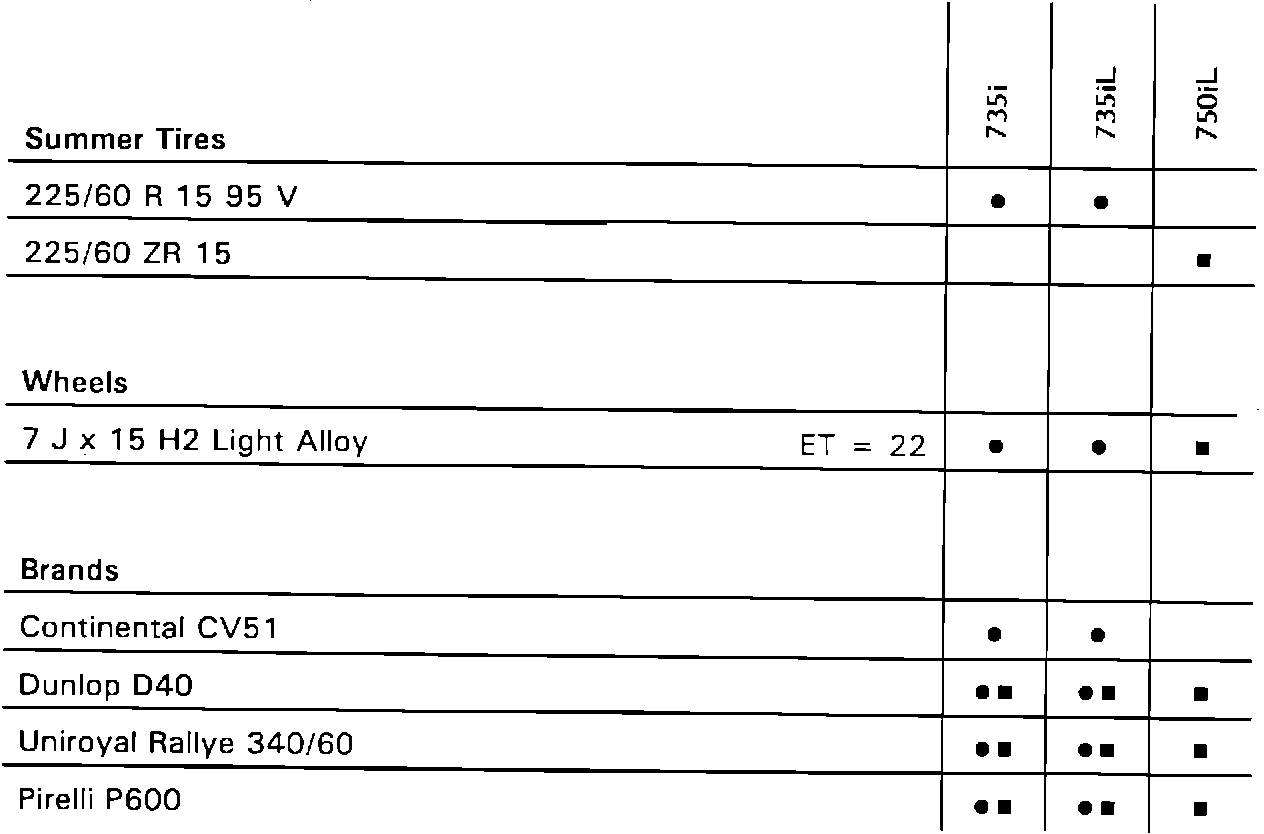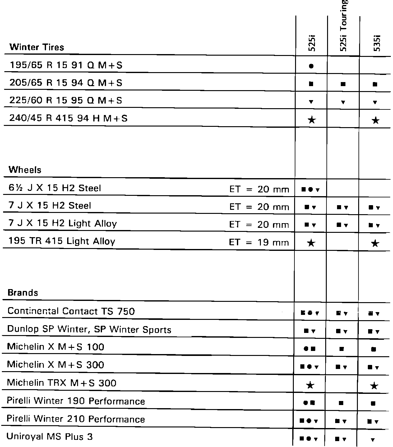 To find what tire, wheel, and brand combination applies to a model, find the proper column for that model. Use the symbols to determine what tire, wheel, and brand apply. The same symbol must appear in all three categories for a particular combination to apply.