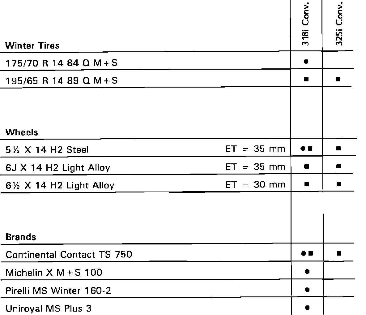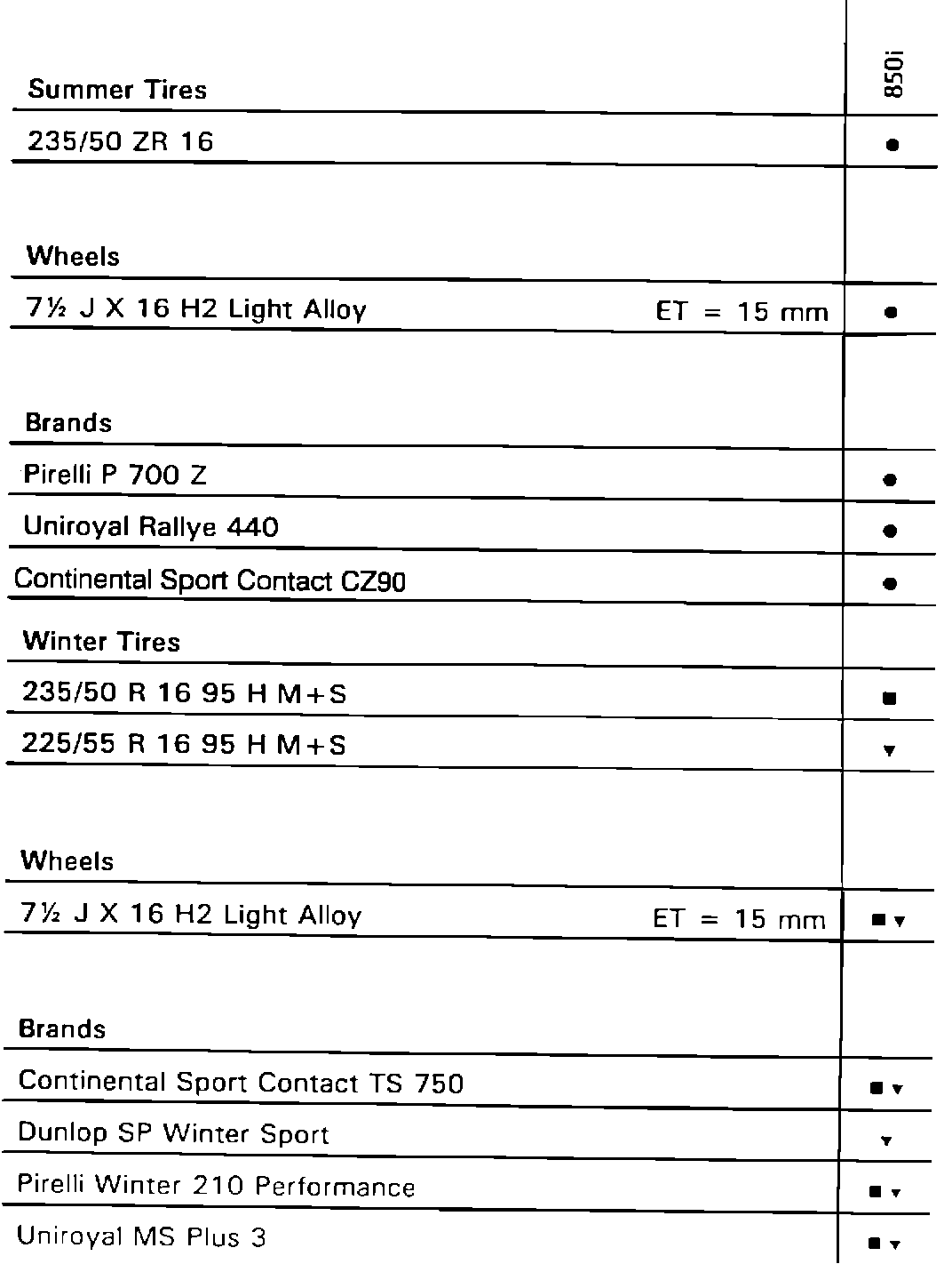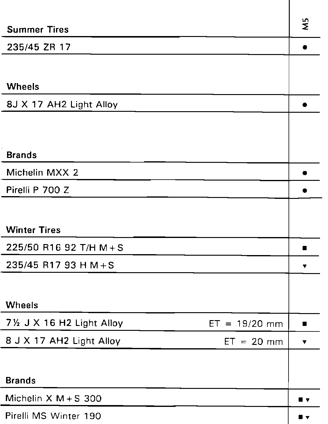 To find what tire, wheel, and brand combination applies to a model, find the proper column for that model. Use the symbols to determine what tire, wheel, and brand apply. The same symbol must appear in all three categories for a particular combination to apply.