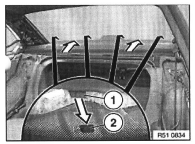 NOTE: Press back shelf downwards and outwards when removing: risk of damage from vent window levers (1).