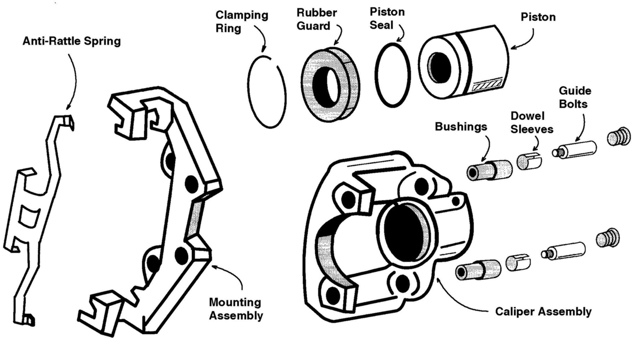 - Place a liner (hard wood, hard felt or similar material) in caliper recess to protect the piston.