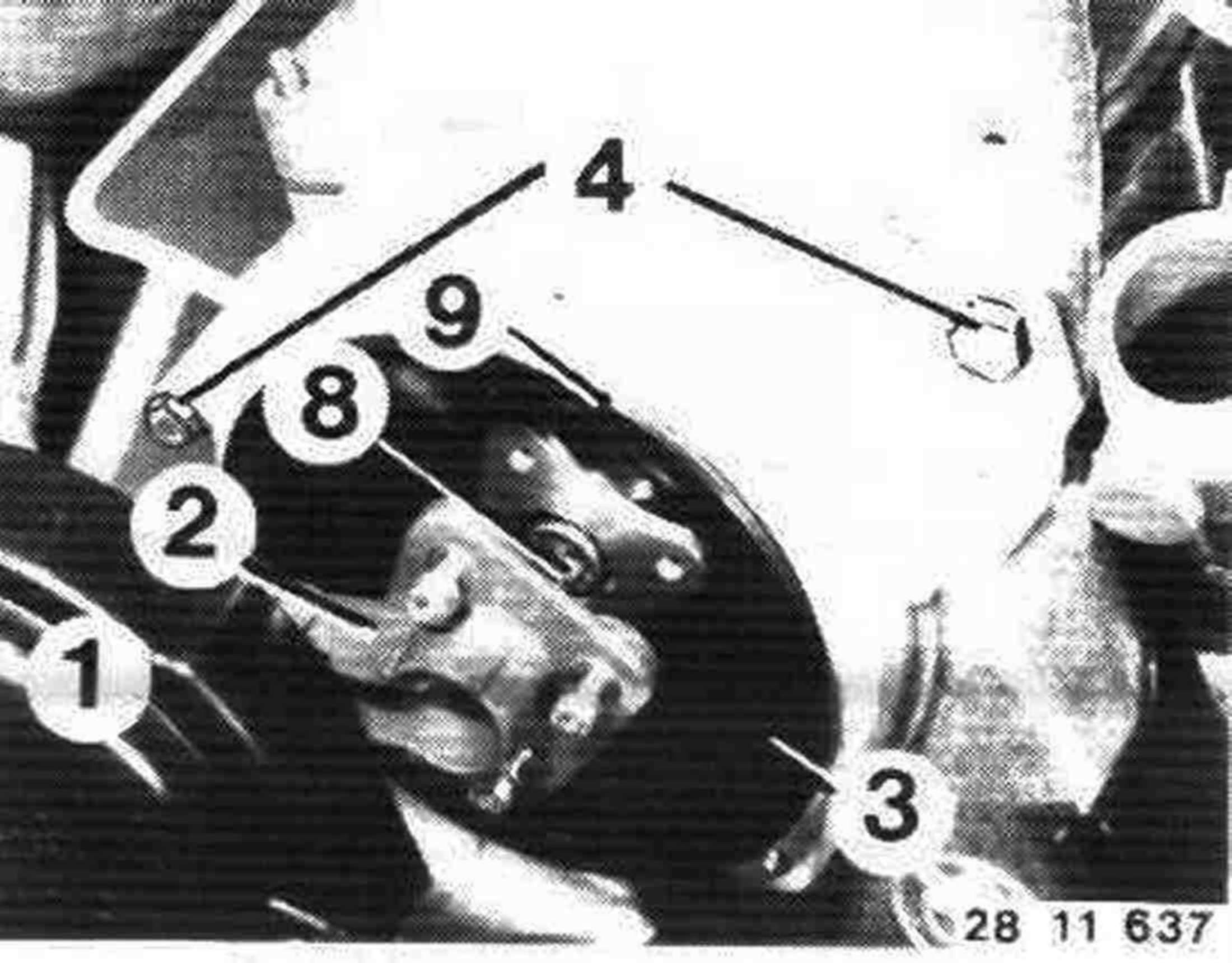 - Bolt down tensioner (tighten bolt (8) first and then bolt (7)).