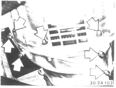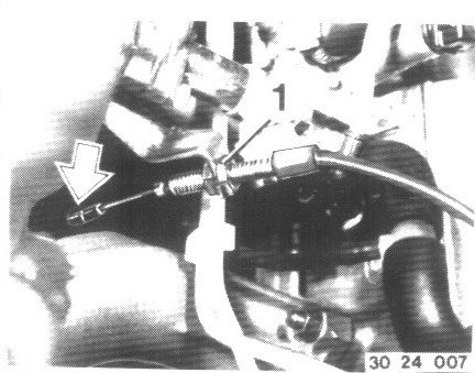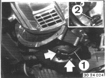 - Unscrew reinforcement plate on engine and transmission and loosen 2 screws of oil level switch enough until the reinforcement plate can be removed after bending holder (1).