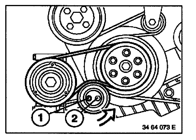 Unfasten screw (1) until tensioning roller rotates without friction. Press the tensioning roller on cap hex (2) with Tightening Torque, against the drive belt, hold tight and tighten down screw (1). Refer to Technical Data 64 52 3AZ.