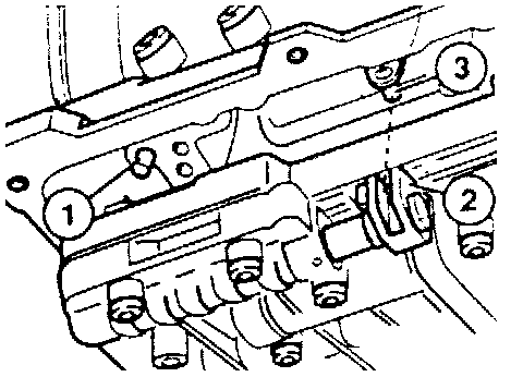 - Reinstall valve body with wire harness. Attach valve body to centering pin (1) and overrun valve (2) in selector lever shaft (3).