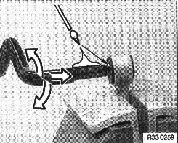 Caution: Immediately rotate stabilizer link into illustrated angular position to stabilizer bar. Once mounting agent has evaporated, stabilizer link can no longer be rotated.