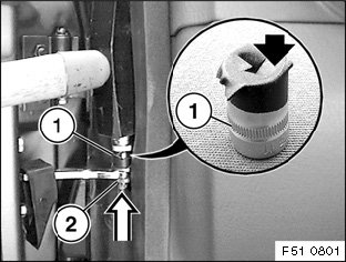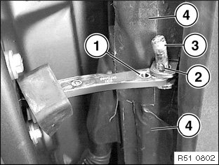 Insert lug (1) in bore. Fit tab (2) on rivet (3) facing door. Pull off fabric adhesive tape (4).