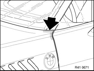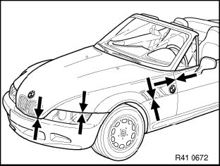 CAUTION: Apply protective coat of anti-corrosion wax to both sides of marked area of hood lid hinge to allow for any subsequent paintwork which may be required, refer to BMW Parts Service.