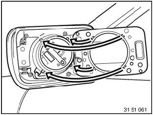 Remove cement between mirror glass and edge of housing (risk of damage).