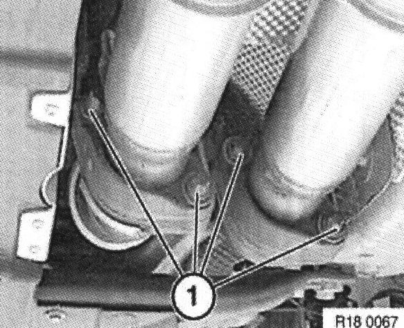 Caution: Support exhaust system with lifting equipment; in so doing, make sure that the exhaust system is heavier at the rear due to the two final silencers/mufflers than at the front. Disconnect plug connector for Lambda oxygen sensor.