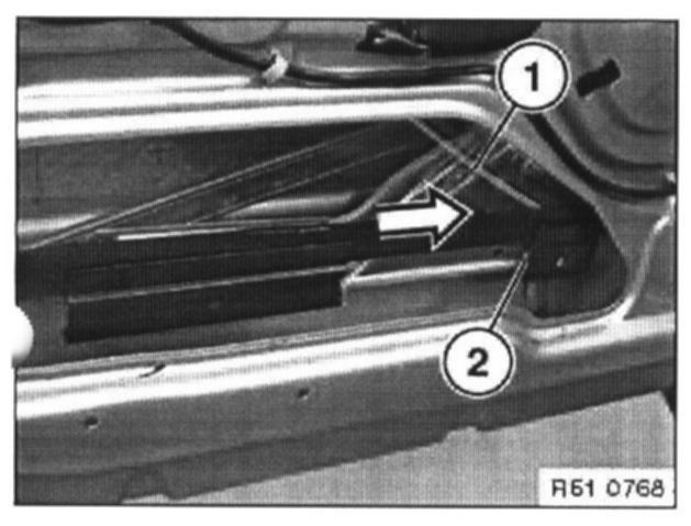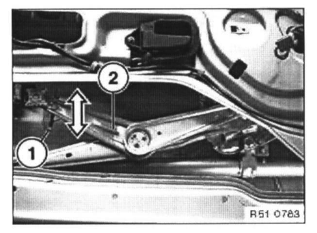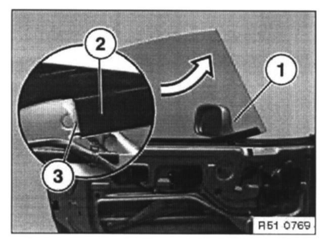 - Carefully push door window (1) upwards and slide bracket (2) out of window regulator support (3).