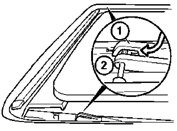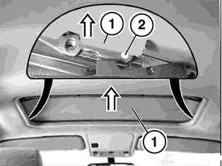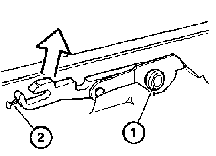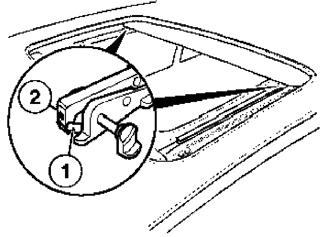 Raise slide/tilt sun roof lid (1) at back until adjusting levers on left/right can be lifted out of retaining pin (2) of slide/tilt sun roof lid (1).