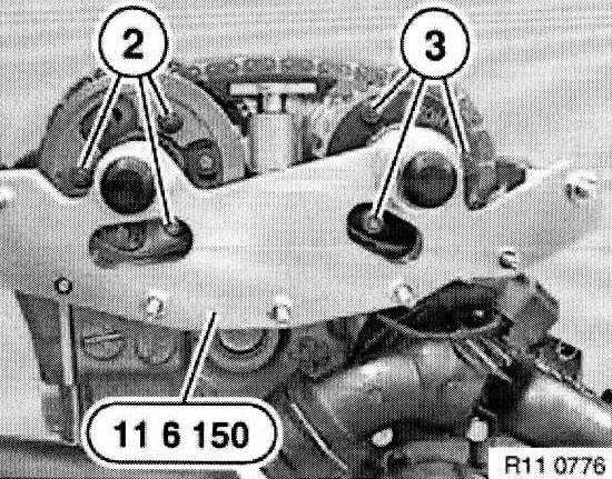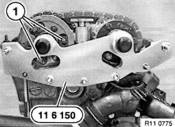 Attach special tool 11 6 150 "without gasket", tighten nuts by hand and then tighten down uniformly until special tool 11 6 150 is in full contact with cylinder head.