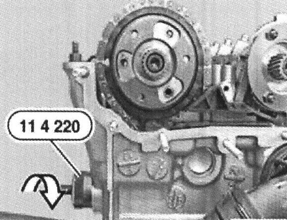 Insert special tool 11 4 220 in cylinder head and bring adjustment screw into contact with tensioning rail, but do not pretension timing chain yet.