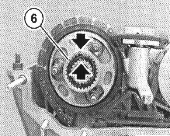 Insert pin of toothed shaft (5) into tooth gaps of splines on camshaft and toothed sleeve (6).