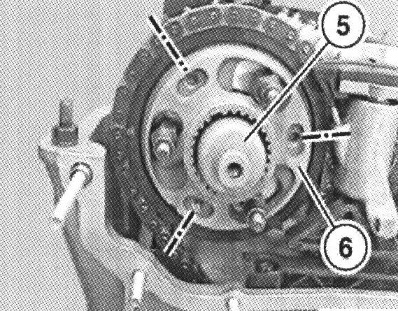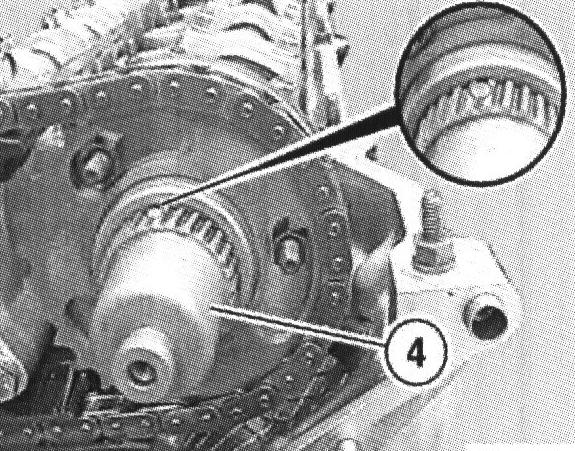 Insert pin of toothed shaft (4) into tooth gaps of splines on camshaft and chain wheel.