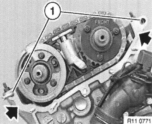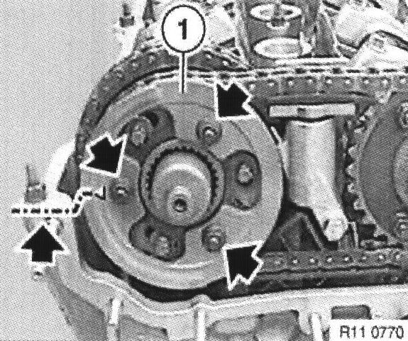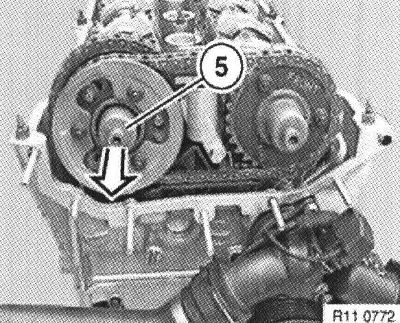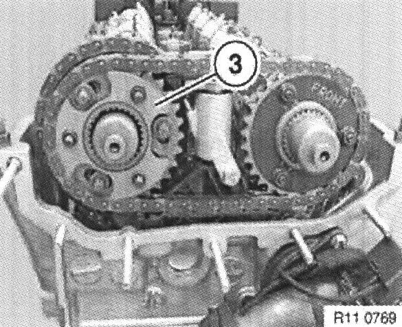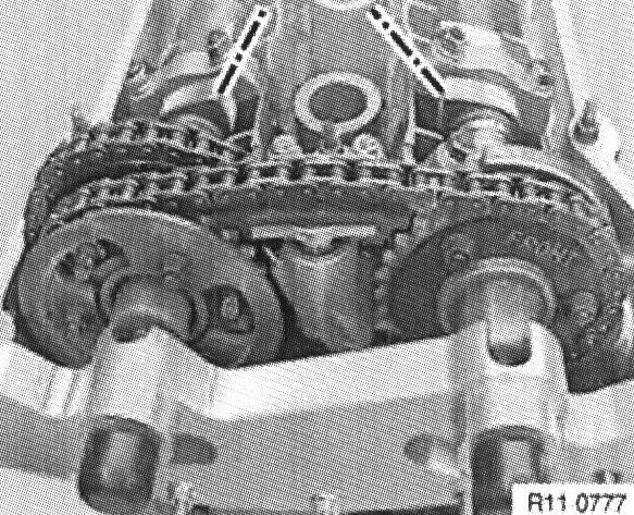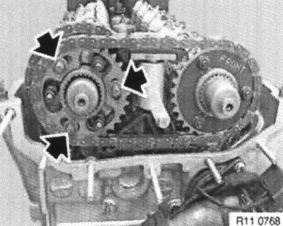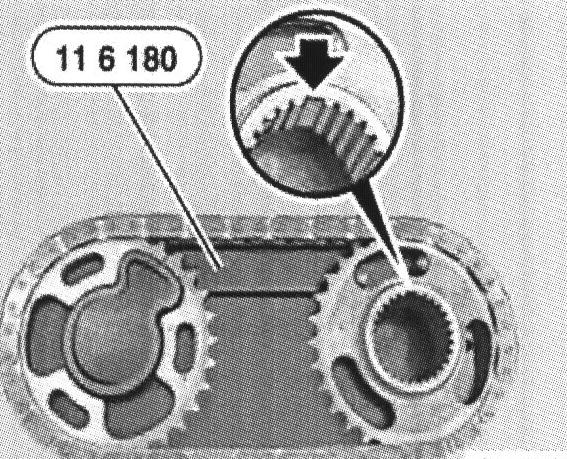 Remove chain with chain wheels in position from special tool 11 6 180 and fit so that the tooth gaps on the inlet side are opposed.