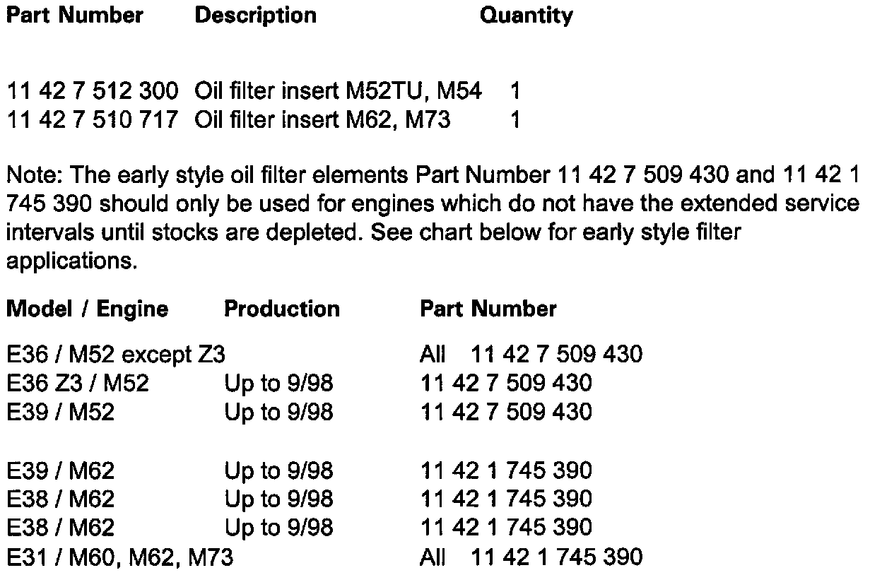 The new oil filter element was phased into production on M54 powered vehicles in 9/00 and on all M62 and M73 powered vehicles in 7/00.