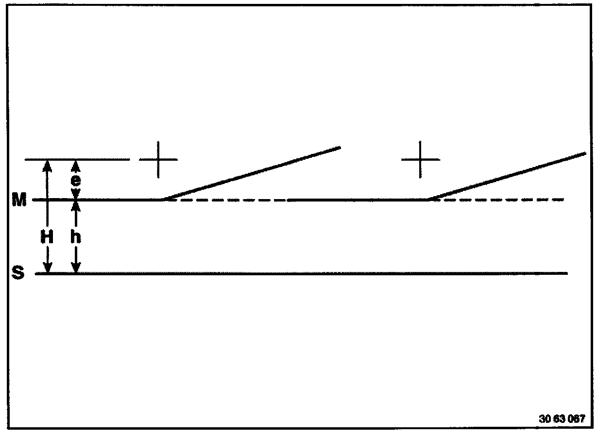Align headlight aimer with vehicle longitudinal axis and parallel to parking surface. Set marking line (M) on aimer to distance (e). Scale graduations on aimer are equal to a gradient in cm at a distance of 10 meters.