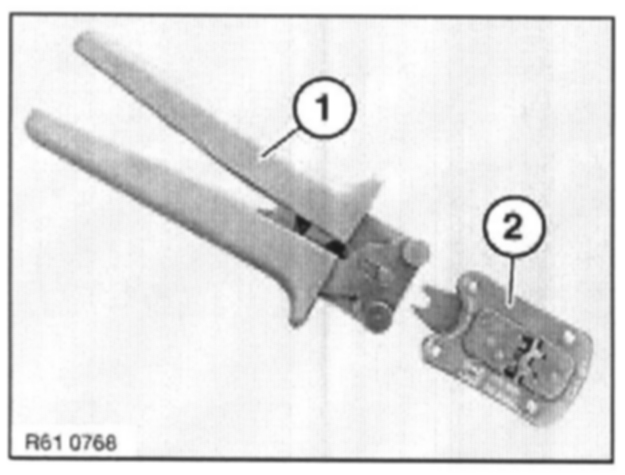 To crimp MQS contacts, use pliers 61 4 321(1) in conjunction with crimping head 61 4 324 (2) from crimping set 61 4 320.