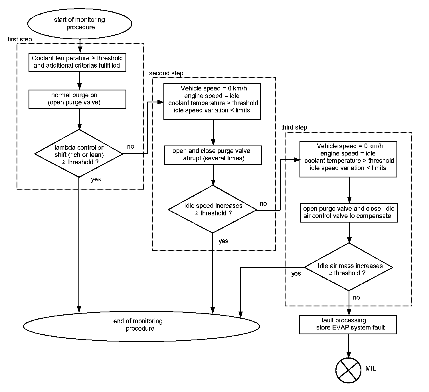 If the threshold at the 2nd step is not reached an additional procedure is performed. The purge valve is opened and the idle air control valve simultaneously is closed to compensate the idle speed increase. The effect is a decrease of the measured idle air mass by the mass air flow sensor.